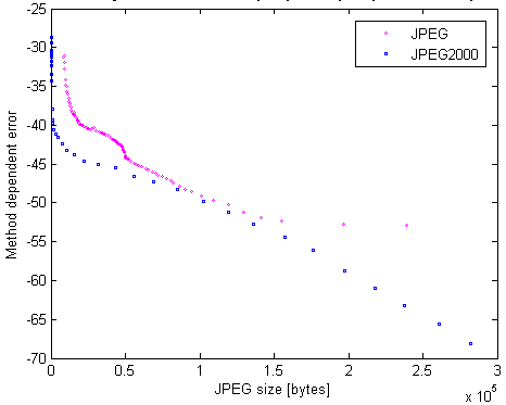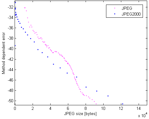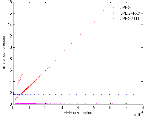 Z tej części eksperymentu wyraźnie widać, że nawet dla bardzo silnej, czasochłonnej i zasobożernej (tego ostatniego nie widać, ale logi Matlab-a pokazują użycie pamięci dla PAQ8f na poziomie 2 GB) opcji kompresji plików JPEG, rezultaty znacznie odbiegają od możliwości JPEG2000.