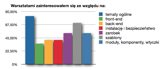 Największe zainteresowanie warsztatami dotyczyło informacji ogólnych, nieco mniejsze tworzeniem własnych szablonów… najmniejsze obsługą front-endu. Szczegółowo zostało to zaprezentowane poniżej: