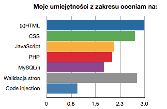 Spory rozrzut pojawił się przy ocenie swojej wiedzy na tematy związane z językami i bezpieczeństwem. Najlepiej wypadła wiedza z zakresu HTML i XHTML, walidacja stron i CSS. Najsłabiej „wstrzykiwanie kodu”. Średnia (mimo, że nie jest to najlepszy sposób prezentacji takich danych) przedstawia się następująco: