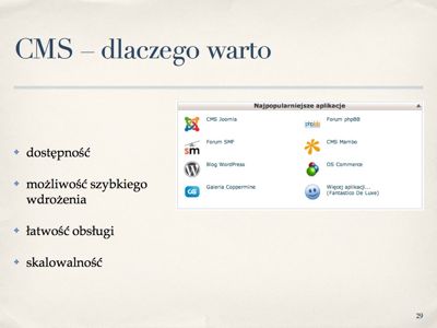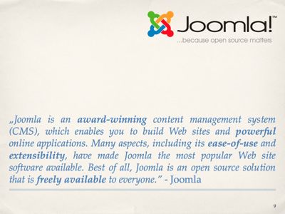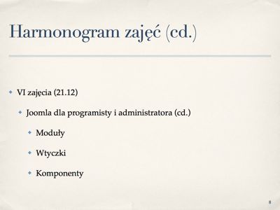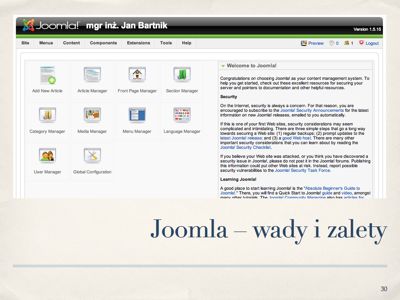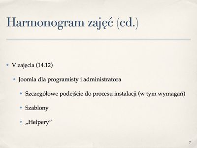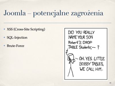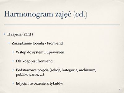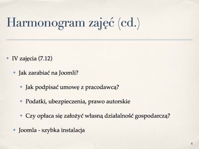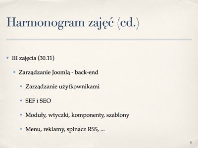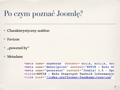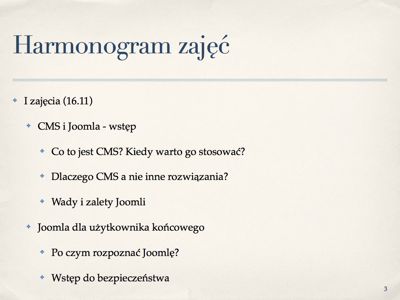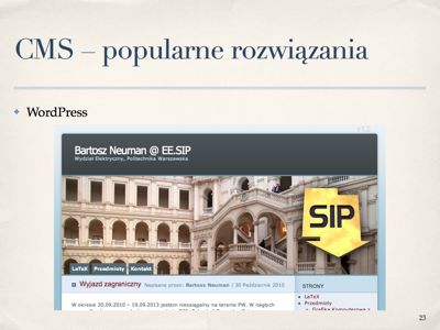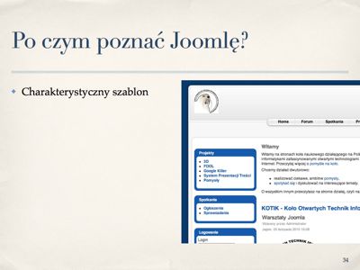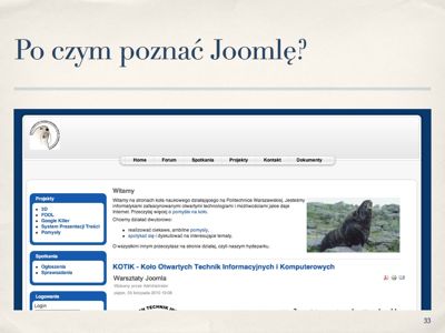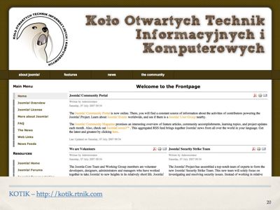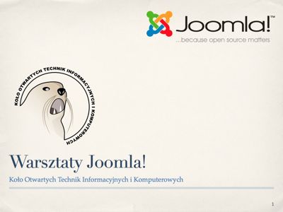Niedawno, bo w ostatni wtorek, odbyły się pierwsze warsztaty z Joomli. Zajęcia odbywają się pod patronatem Koła Otwartych Technik Informacyjnych i Komputerowych na Wydziale Elektrycznym w sali GE-200 (II piętro) we wtorki o godzinie 16.15. Wszystkich, którzy chcieliby uczestniczyć w Warsztatach serdecznie zapraszamy – udział jest bezpłatny i nieograniczony. Nawet jeśli nie było Cię na pierwszych zajęciach możesz zapoznać się z harmonogramem (znajdziesz go w dzisiejszej prezentacji) i przyjść na dowolny z nadchodzących terminów.